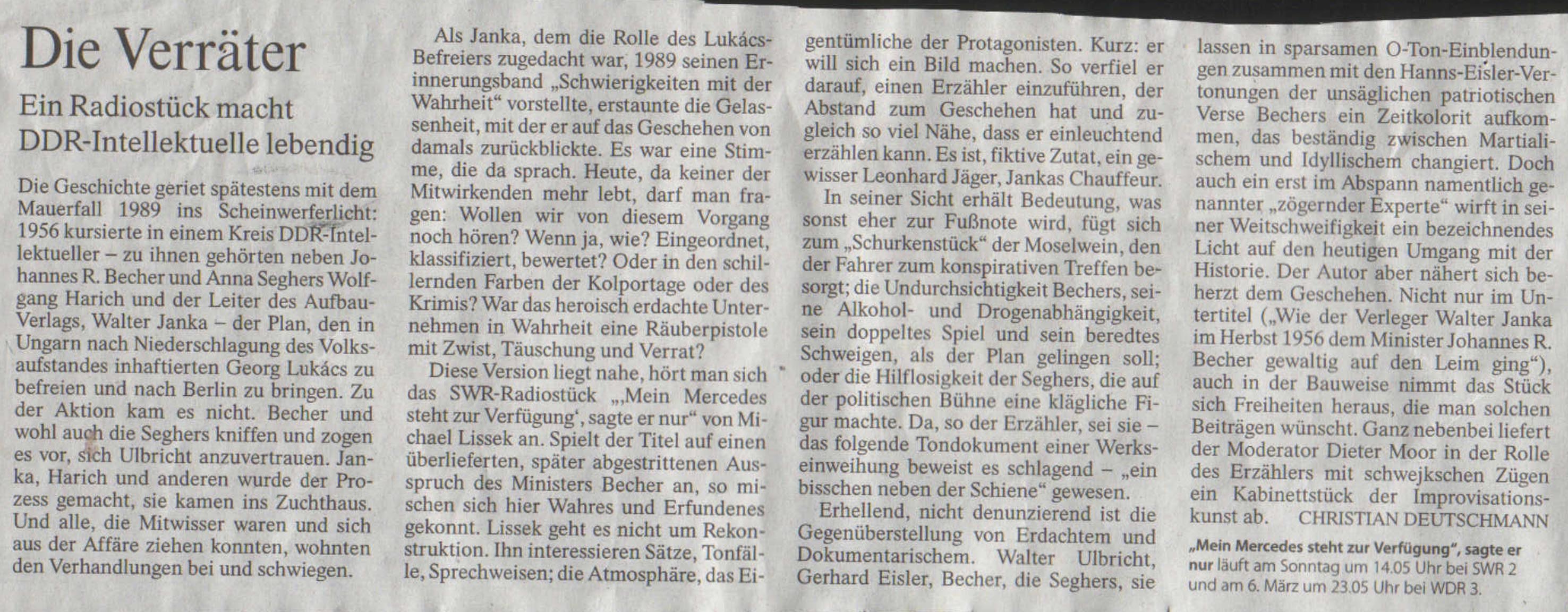 im hintergrund kommt ein bus. diese unglaubliche geschichte, die walter janka 1989 in seinen erinnerungen beschreibt und stefan heym schon 10 jahre früher zu einer szene in dem roman "collin" ausbaute, benötigt einen geschmeidigen erzähler. einen, der überall dabei war und intimkenntnisse der protagonisten hat: den chauffeur leonard jäger, der janka noch aus dem spanischen bürgerkrieg kennt und hin und wieder auch der chauffeur anna seghers war. den die geschichtlichen umstände ans "steuerrad der mächtigen" gespült haben... dank der spielfreude des schauspielers dieter moor, der die rolle des chauffeurs besetzt, ist "mein mercedes steht zur verfügung" zu einem intensiven spiel von fiktion und realität geworden; zu einer auslotung der möglichkeiten des ERZÄHLENS im akustischen radiofeature. dieter moor